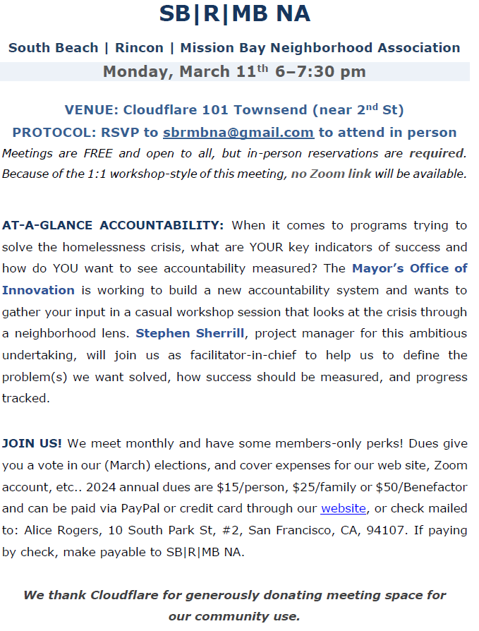 - MONDAY, MARCH 11TH – SB|R|MB NA MEETING BRINGING INNOVATION TO THE CRISIS OF THE UNHOUSED