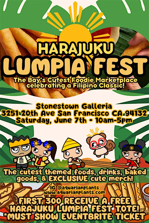 Join us in SAN FRANCISCO on June 7th for the Bay Area’s BIGGEST LUMPIA Festival! Enjoy DELICIOUS food, exclusive merch, cute photo ops with your favorite iconic cute characters, LOTS of lumpia, and so much more! Food and fun all at The Bay’s Cutest Marketplace for both you and all your friends and family to enjoy!